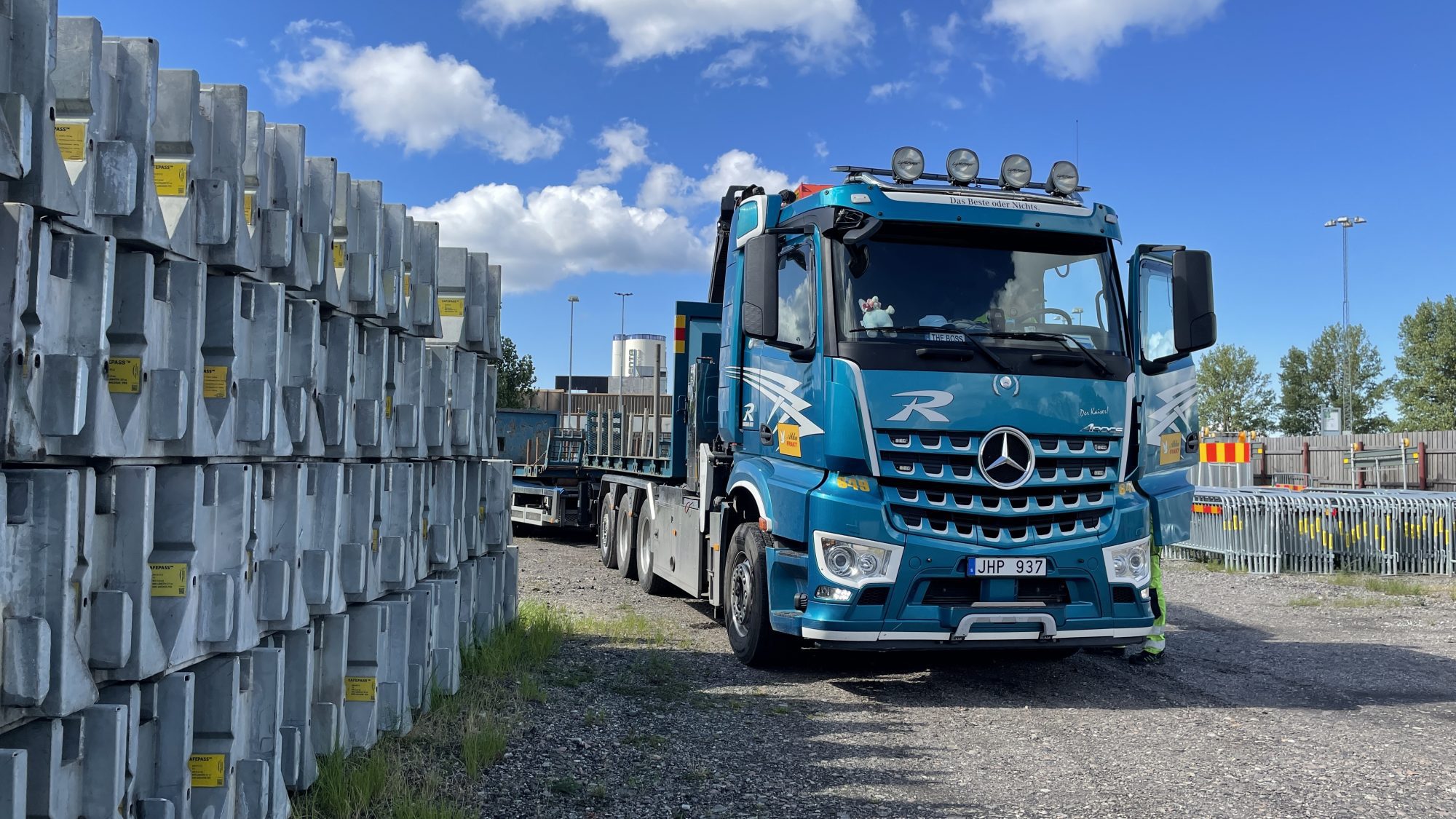 På besök hos Ramirent Sverige. Uppdraget börjar med att ta fram lyftredskapet – den s.k. ”saxen”, ur förrådet. Sedan backar vi till inför lastningen. Därefter kommer den roligaste delen, alltså att lyfta de s.k. Safepass-betongelement, som är fordonsbarriär för avstängning vid vägarbeten, på flaket.