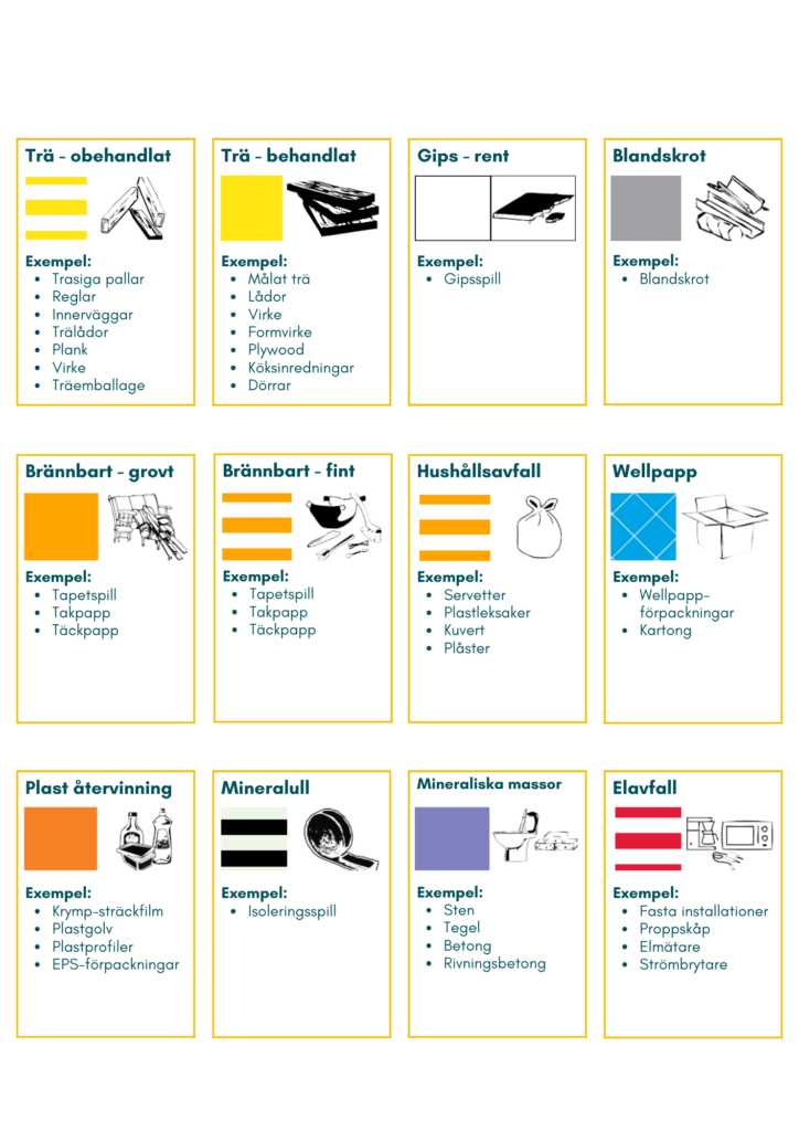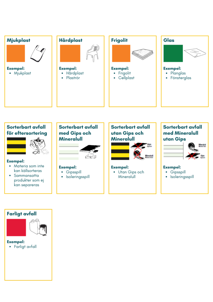Enligt avfallsförordningen ska den som producerar bygg- och rivningsavfall sortera ut vissa avfallsslag (trä, mineral, metall, glas, plast och gips) och förvara dem skilda från varandra och från annat avfall. Nedan har vi listat en guide som vi använder i vårt startmöten och kan även utbilda personalen direkt på arbetsplatsen.